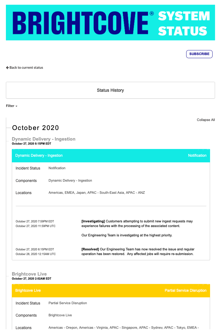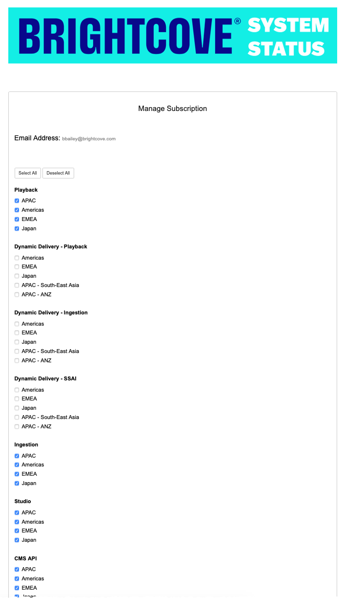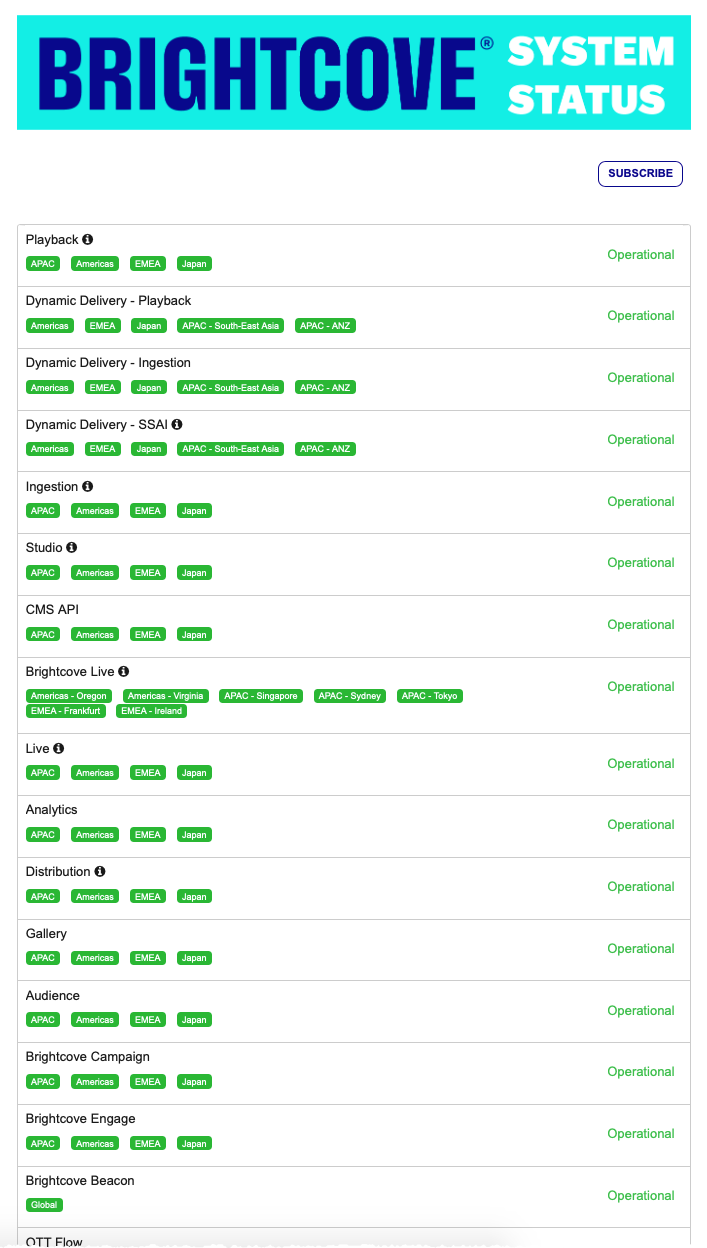 Brightcove überwacht kontinuierlich den Status aller Brightcove Services und Anwendungen. Wenn es zu Betriebsunterbrechungen kommt, wird eine Notiz auf der Seite „Systemstatus“ veröffentlicht. Alle geplanten Wartungshinweise werden ebenfalls auf dieser Seite veröffentlicht.